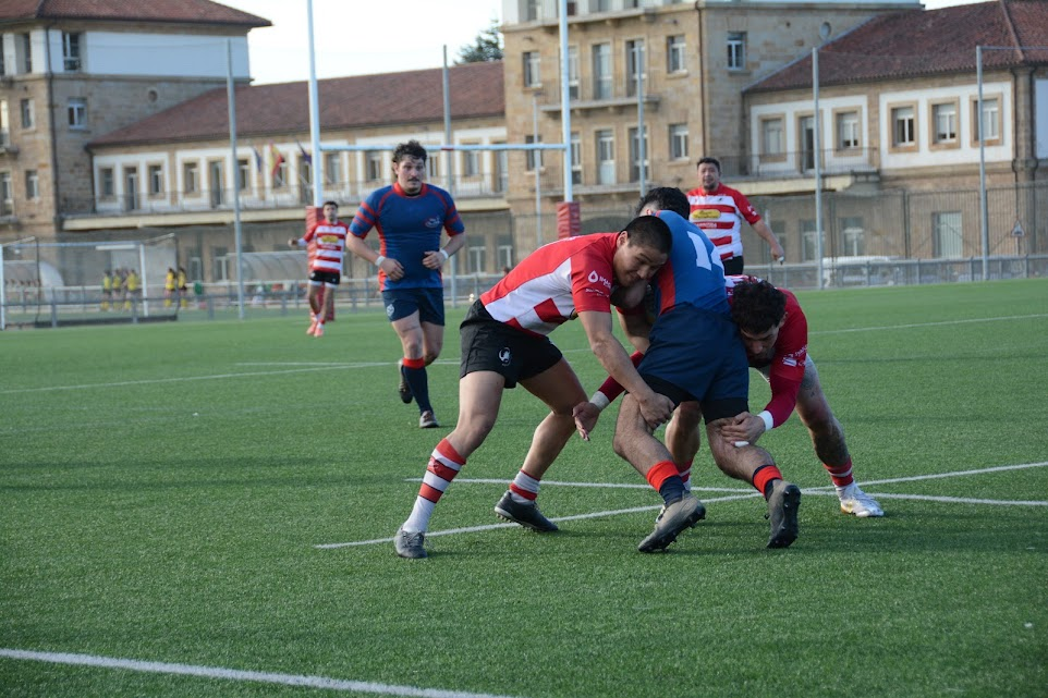 Resultado engañoso, en un partido muy igualado y que no se decantaría hacia el lado rojiblanco hasta los últimos minutos de juego. Comenzaría el partido adelantándose el Gijón en el séptimo minuto de juego, con un ensayo de Javi del Pozo transformado por Cristian. Justo después, el equipo cántabro igualaría el partido con un ensayo transformado. Pasado el cuarto de hora de juego, Eirik anotaría la segunda marca para los rojiblancos que nuevamente Cristian transformaría. El equipo cántabro, se aprovecharía de las indisciplinas rojiblancas y anotaría dos transformaciones de golpe de castigo que dejaban el marcador en un ajustado 14 a 13 pasado el minuto veinticinco de juego. En la recta final de la primera mitad, sería el Gijón quien aprovecharía las indisciplinas cántabras y haría lo propio con otros dos golpes de castigo que dejaban el marcador al descanso en 20 a 13, con todo por decidir tras la reanudación.