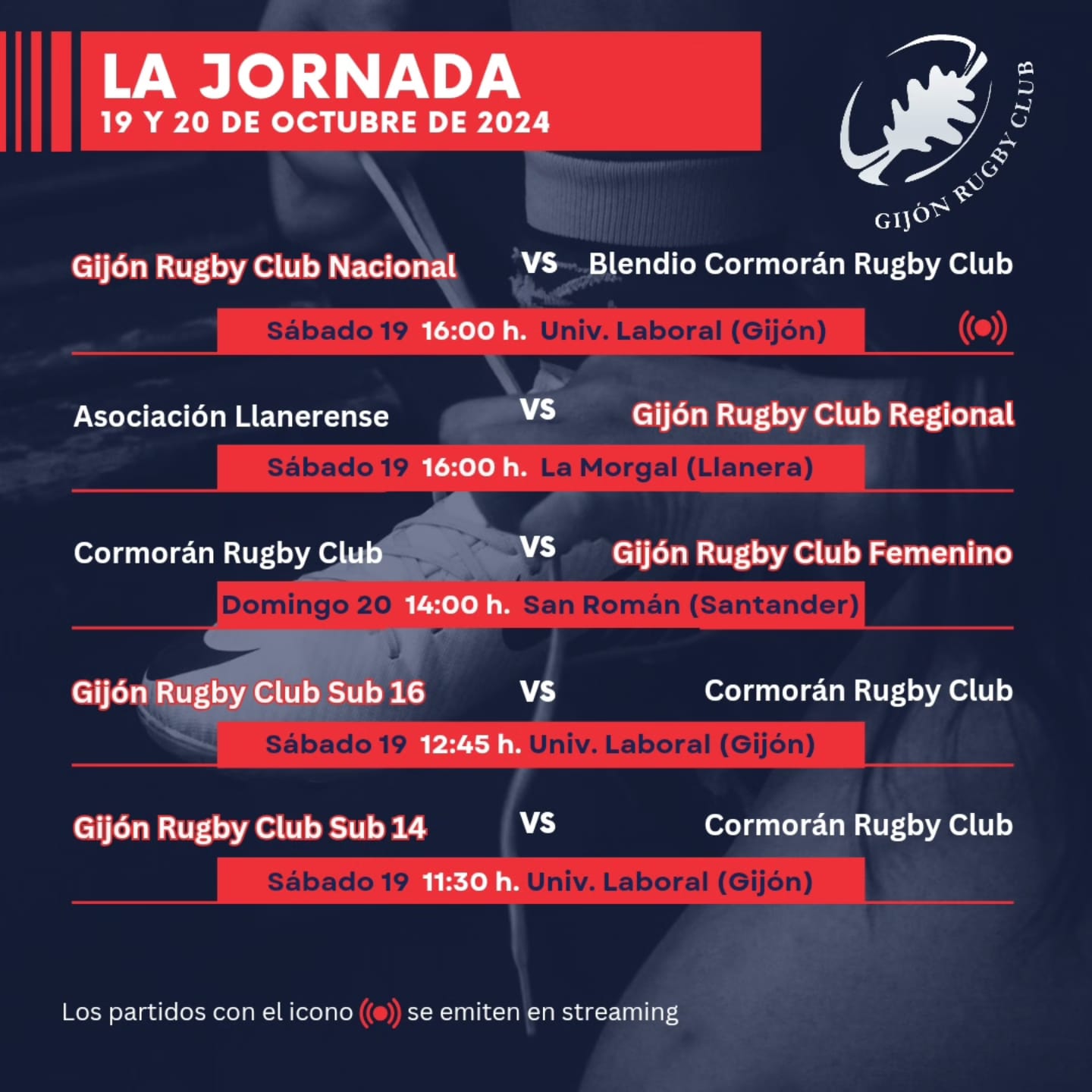 Por último, los equipos sub16 y sub14, también tendrán actividad ante el Cormorán Rugby Club. El equipo sub16 afronta su segundo partido de la temporada con la intención de mantener el buen nivel mostrado en la primera jornada. Su choque dará comienzo a las 12:45 horas con arbitraje de Julio López. Anteriormente, desde las 11:30 horas, tendrá lugar el debut competitivo del equipo sub14, bajo arbitraje de Ignacio Ponga. Ambos partidos se disputarán en la Universidad Laboral en la mañana del sábado.