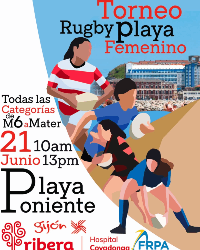 La Federación de Rugby del Principado de Asturias con la colaboración del Grupo Ribera – Hospital Covadonga y del Ayuntamiento de Gijón, organizan este sábado 21 en la playa de Poniente un Torneo de Rugby Playa Femenino.