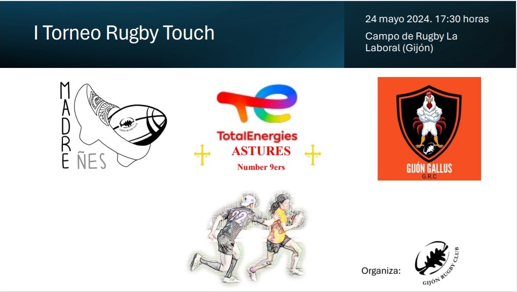 Este próximo viernes 24 de mayo, el Gijón Rugby Club organiza un torneo de rugby touch desde de las 17:30 horas en el campo sintético de la Universidad Laboral, en el que participarán sus dos equipos de padres y madres (Gijón Gallus y Madreñes, respectivamente) y un equipo con los empleados de TotalEnergies en Asturias, bajo la denominación de Astures Number 9ers by TotalEnergies.