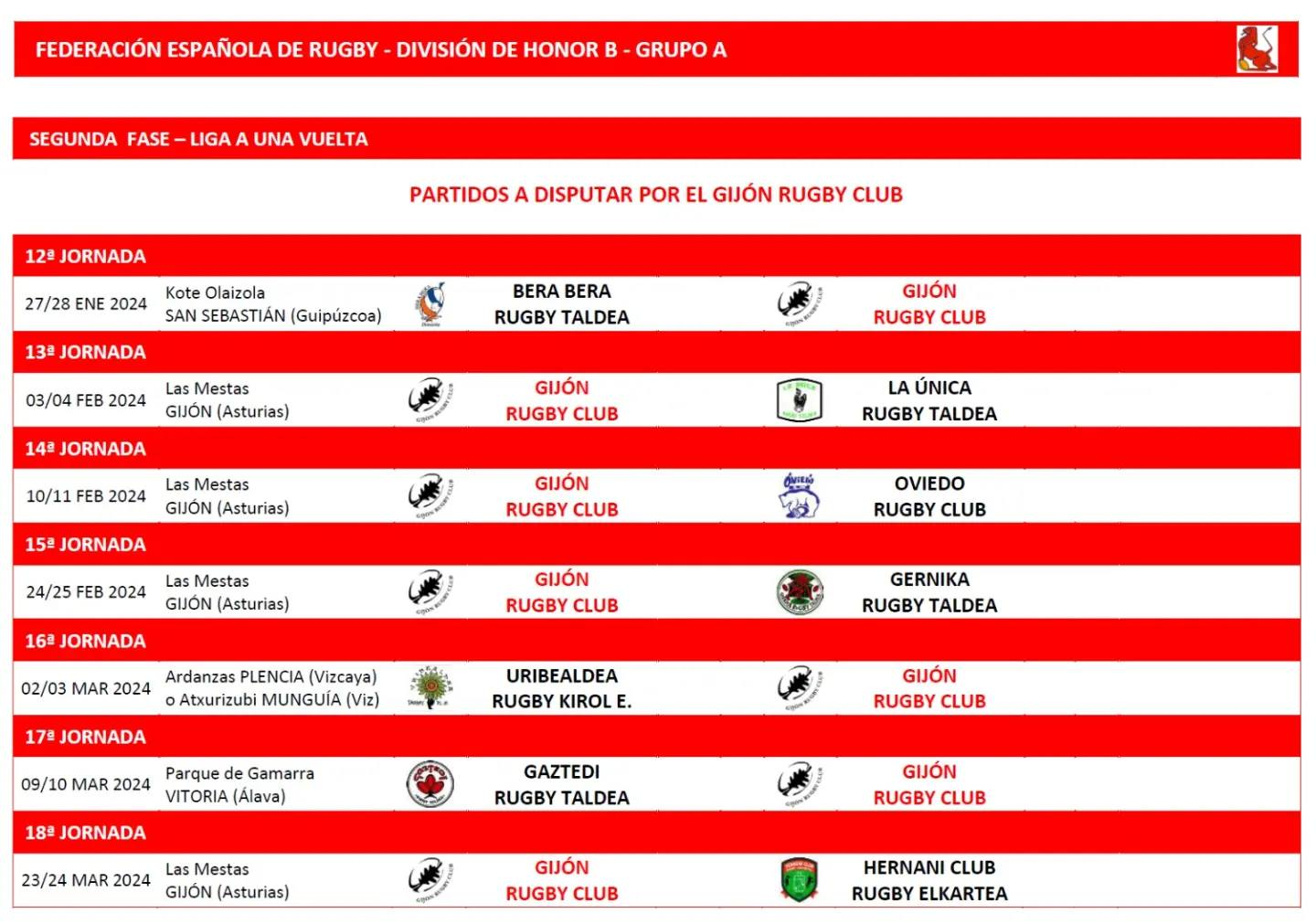 Por otro lado, la Federación Española de Rugby realizó este pasado martes el sorteo de la segunda fase de la Liga de División de Honor – B y nuestro equipo ya conoce el calendario que tiene por delante de aquí a final de temporada.